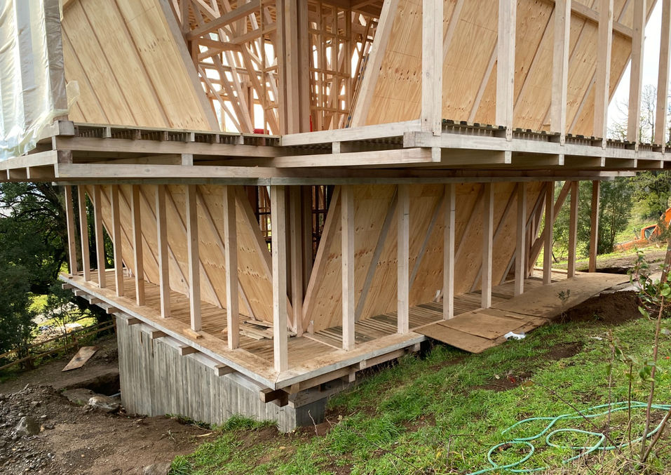 El desafío principal fue alinear los pilares centrales de madera con herrajes embutidos en las fundaciones metálicas, garantizando estabilidad y una conexión segura entre los elementos estructurales.